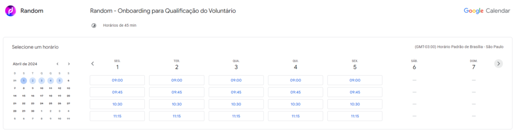 No link do calendário abaixo montamos uma agenda  a partir de 1 de abril para reuniões de aproximadamente 45 minutos sobre este tema: